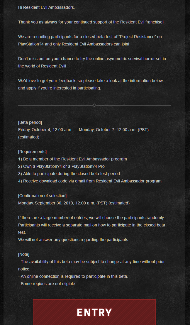 生化危机系列新作《Project Resistance》开始邀请注册测试了!邮箱查收