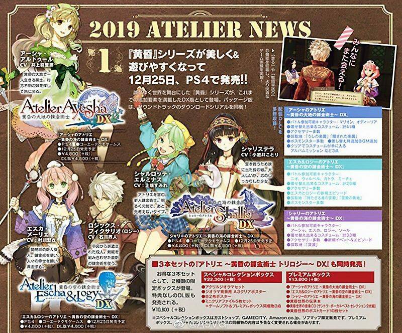《工作室》黄昏系列三部曲DX版本:《亚莎的工作室DX》、《艾斯卡与罗吉的工作室DX》、《夏莉的工作室DX》确定将于12月25日发售,价格各4800日元+税,对应PS4、Switch和PC平台。另外3款游戏的实体套装版13800日元+税、豪华版22300日元+税,无特典下载版10800日元+税。
