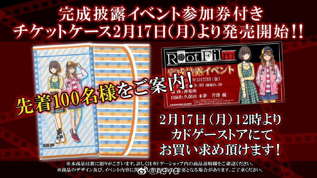 角川游戏将于3月27日举办新作《方根胶卷》的完成披露会。原本预定给到场观众赠送原创纸袋和文件夹。但考虑到观众的健康,角川临时决定将送文件夹换成送口罩,并希望大家都能戴好口罩参加活动。