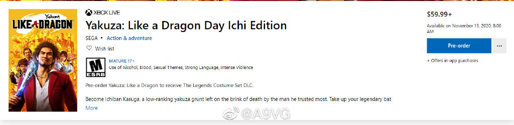 微软商城泄露《如龙7》欧美版将于11月13日推出。