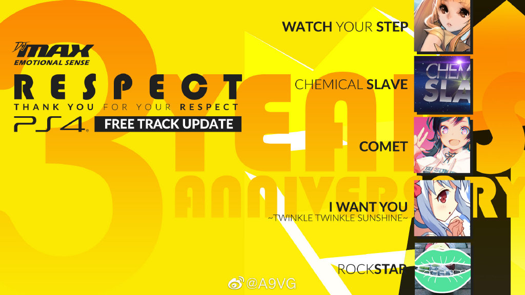 今日是PS4《DJMAX 致敬》发售三周年,为庆祝这一纪念,官方宣布将通过免费更新追加五首新曲,名单如下:
