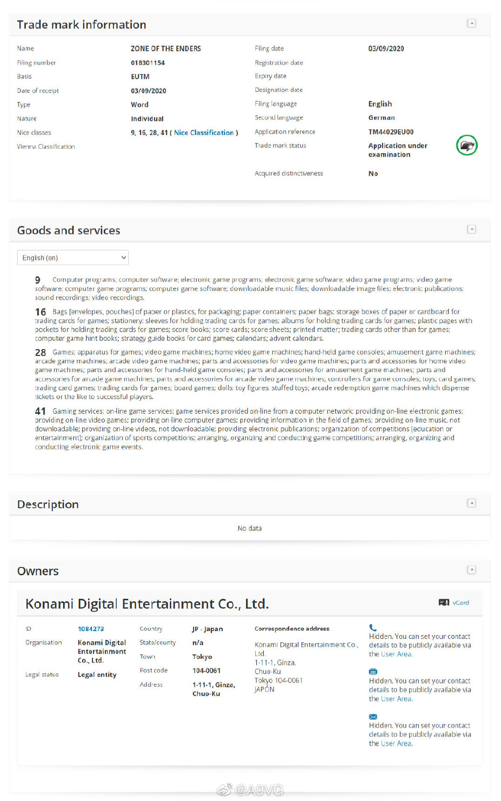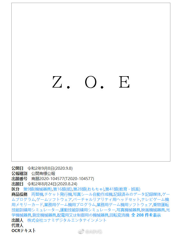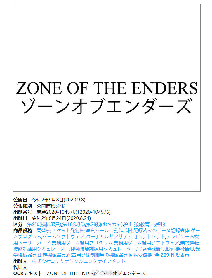 根据外媒Gematsu的消息,Konami近期除了在美国之外,在日本与欧洲也注册了《终极地带》(Zone of the Enders)的新商标,分类为游戏软件。另外Konami确认将在TGS游戏展期间发布旗下新作的消息,举办时间为北京时间9月26日晚上7点至7点50分,不知《ZOE》新作是否会在这场发布会中公开。