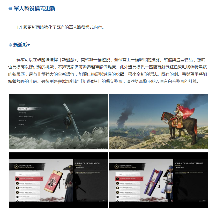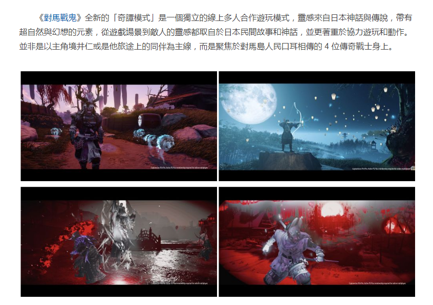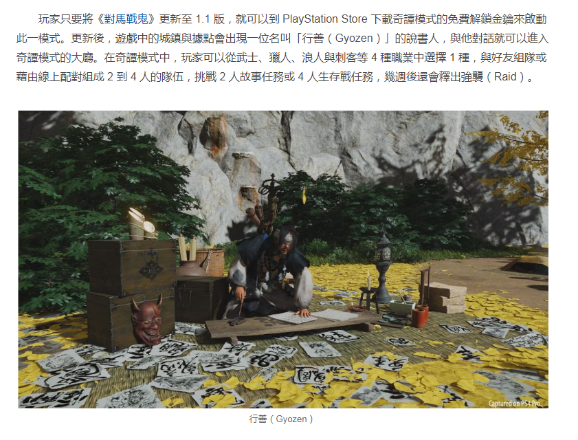 索尼互动娱乐(SIE)旗下 Sucker Punch Productions 工作室开发,目前贩售中的 PS4 开放世界动作冒险游戏《对马战鬼(Ghost of Tsushima)》,现宣布将于 10 月 16 日释出 1.1 版免费大型更新,追加线上多人合作游玩模式「奇谭模式(Legends)」以及「新游戏+(New Game+)」在内的一系列新模式与新内容。