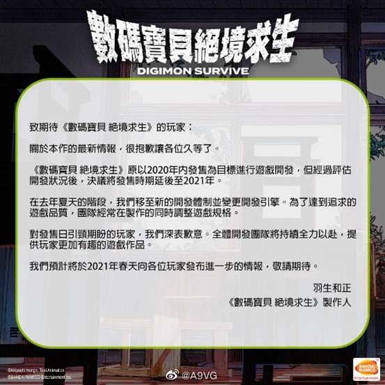 最新作《数码宝贝 绝境求生》则由原定的2020年内延期至2021年发售,繁体中文版亦然,本作预计登陆PS4/Xbox One/Switch/PC平台。
