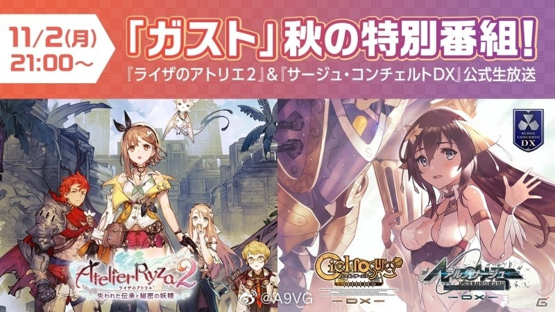 光荣特库摩预告,将于11月2日北京时间20点举办直播节目「GUST秋季特别节目」,公开《莱莎的炼金工房2》&《静籁之空·永恒DX》两款作品的特别情报、新影像与实机演示,为莱莎配音的声优野口百合与为依恩配音的加隈亜衣将作为嘉宾出演。