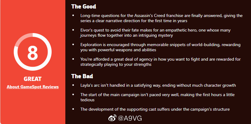 《刺客信条 英灵殿》媒体评分解禁,IGN 8分,Game Spot 8分,GameInformer 9.25。MC均分85,共收录12家媒体。