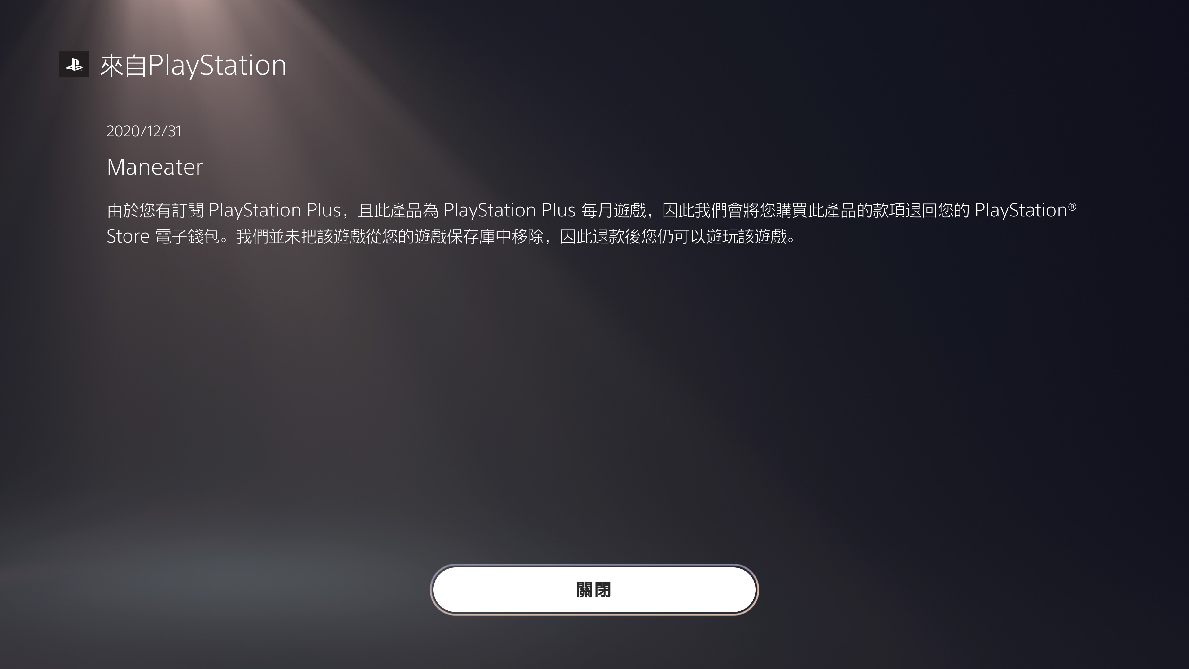 事情是这样的:食人鲨于12月4号登录的ps4和ps5,12月23号题主原价购买了价值300多港币的食人鲨ps5版,并于12月26号白金,今天早上起来一看新闻,1月ps5会免游戏食人鲨,我:??? 还想着是不是给客服联系联系,申诉一下,但也估计要不回来,没想到ps5一开机就收到了如图信息,我永远支持索尼.jpg