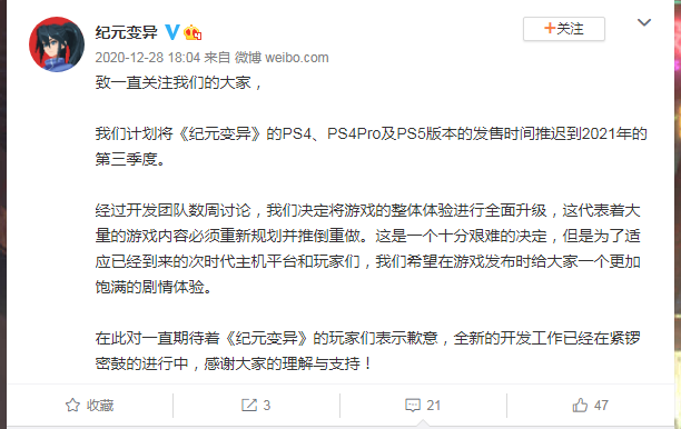 我们计划将《纪元变异》的PS4、PS4Pro及PS5版本的发售时间推迟到2021年的第三季度。