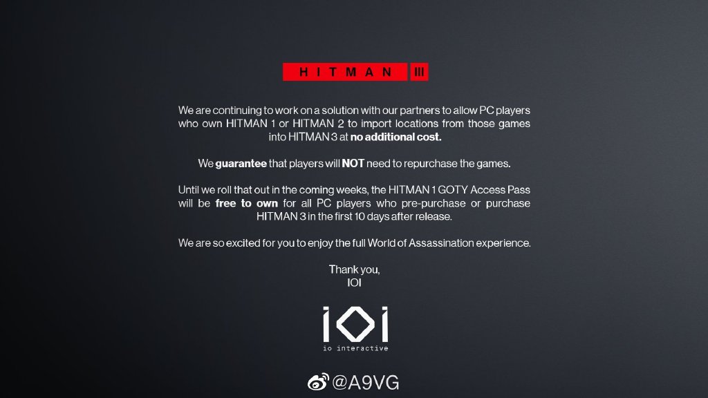 IO Interactive表示正在与合作伙伴研究解决方案,能够使拥有PC版《杀手》《杀手2》的玩家将关卡导入《杀手3》,无需支付任何额外费用。目前预购《杀手3》以及游戏推出前10天内购买的玩家,可免费获得《杀手3》的“初代游戏通行证”(即可在3代中游玩第一作的关卡),另外之前通过Epic免费游戏领取了《杀手 年度版》的玩家也可免费获得通行证。