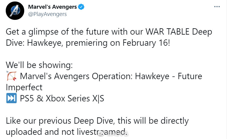 晶体动力工作室宣布《漫威复仇者联盟》最新直播活动将于2月16日举行,直播内容将以后续更新角色“鹰眼”与PS5、XSX版本相关情报为主。