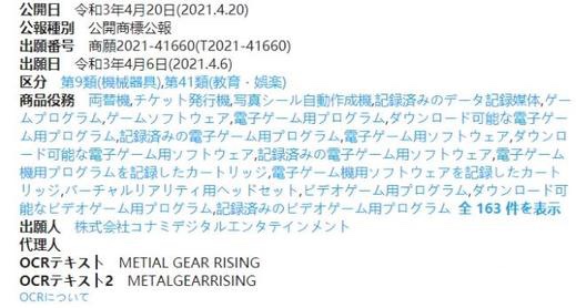 科乐美于4月6日在日本注册了《恶魔城》的新商标“悪魔城ドラキュラ”,以及《合金装备 崛起》的新商标“METIAL GEAR RISING”.