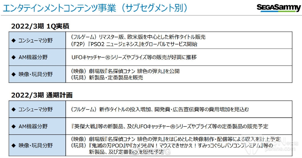 该季度的娱乐内容业务继续保持良好势头,其中主机游戏方面,网游《梦幻之星在线2 新起源》正式开服,此外还推出了一些游戏的欧美版与复刻/移植版,并没有什么特别值得一提的全新大作,游戏软件总销量为658万份(上一财年同期为1298万份),街机业务也逐步恢复。最终销售额达474.4亿日元,同比增长了5.1%。未来会有《审判之逝 湮灭的记忆》《真女神转生5》等多款新作发售。