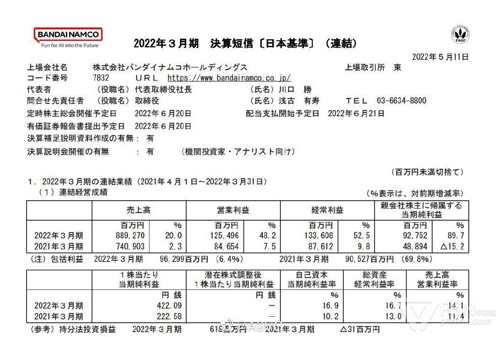 【老头环出货量已破1340万份】万代南梦宫今日公开21-22财年年度财报,该财年销售额8892.7亿日元,同比增长20.0%,营业利润1254.96亿日元,同比增长48.2%。