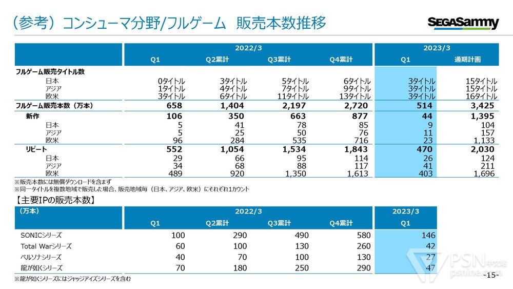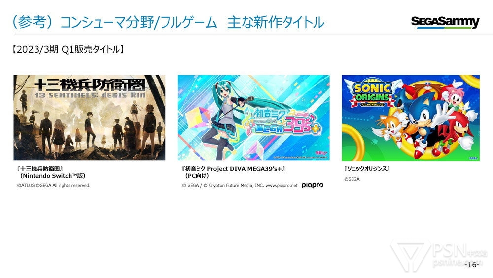 其中以家用游戏为中心的娱乐内容业务方面,由于在该季度发售的新作以各种移植版为主,例如《十三机兵防卫圈》Switch版、《初音未来 歌姬计划 MEGA39's+》PC版等,销量较上一财年有所下滑(具体数字为44万份),其他旧作销量为470万份,游戏软件总销量为514万份(上一财年同期为658万份)。