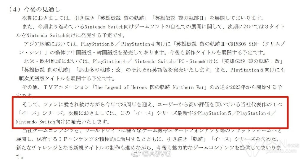 【伊苏新作明年见】日本Falcom 在今日发布的最新财报中宣布,《伊苏》系列最新作将在下一个财年内(2023年9月30日前)发售,登陆平台为PS5/PS4/Switch。