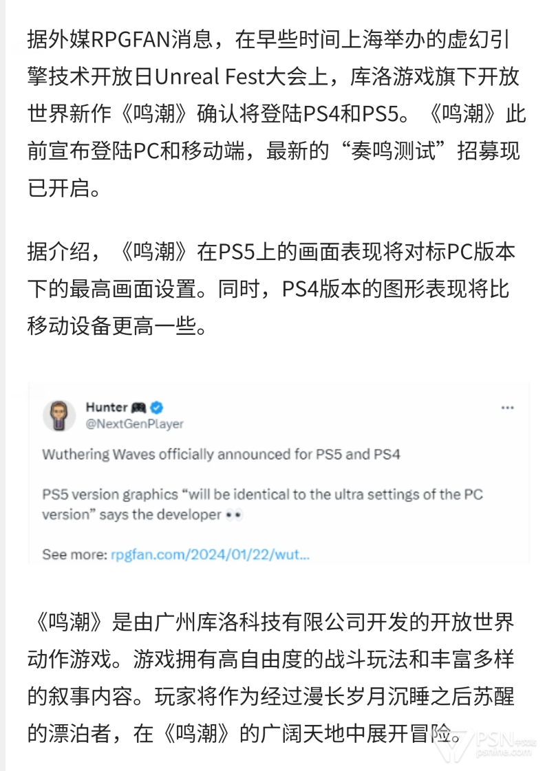 国产手游鸣潮将登录PS5