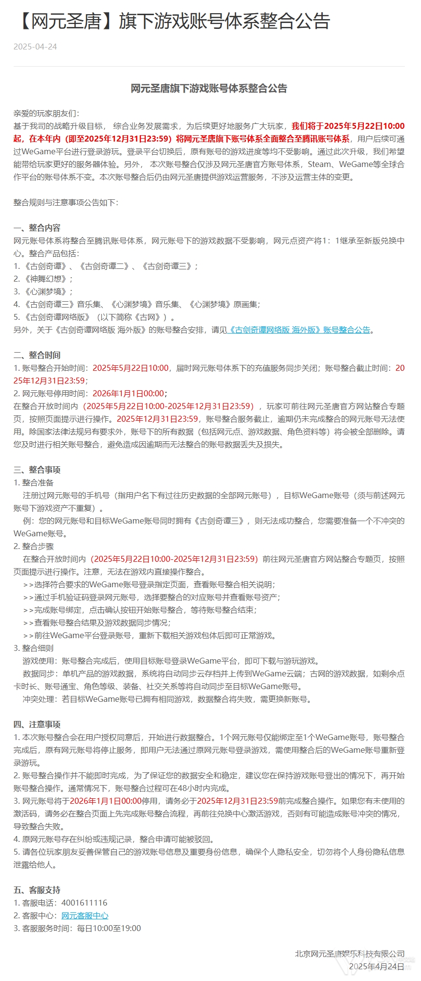 网元圣唐旗下账号体系将从北京时间2025年5月22日10:00起全面整合至腾讯账号体系,整合渠道开放截止至2025年12月31日23:59。用户后续可通过WeGame进行登录游玩,原有账号的游戏进度等均不受影响。网元账号将从2026年1月1日0:00起停用。