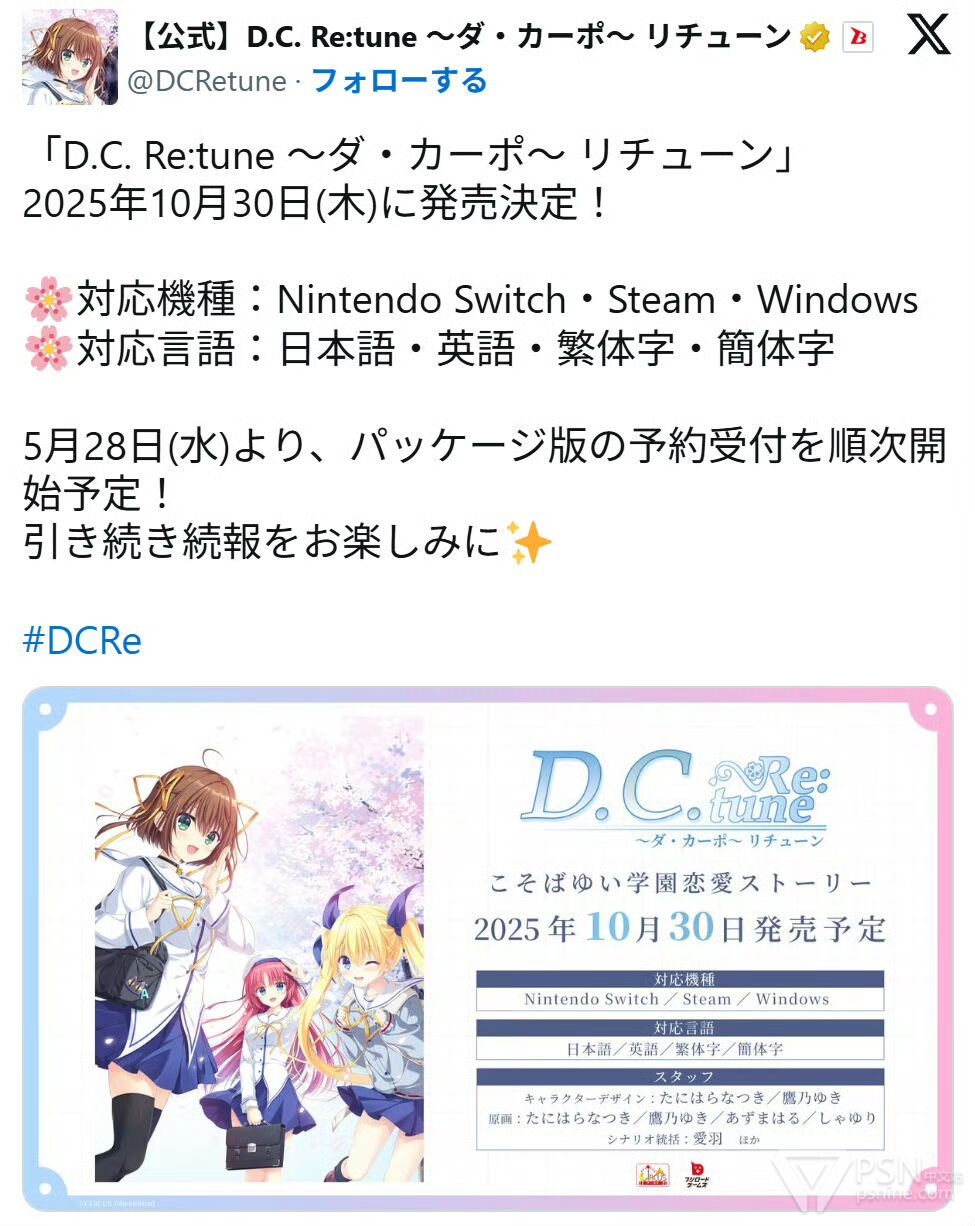 《初音岛 Re:tune》确认将于10月30日发售,登陆Switch/PC平台,支持中文。本作为经典恋爱ADV《初音岛》的完全重制版,由和原作相同的CIRCUS负责制作,作为新要素将会追加全新的女主角“風祈”。