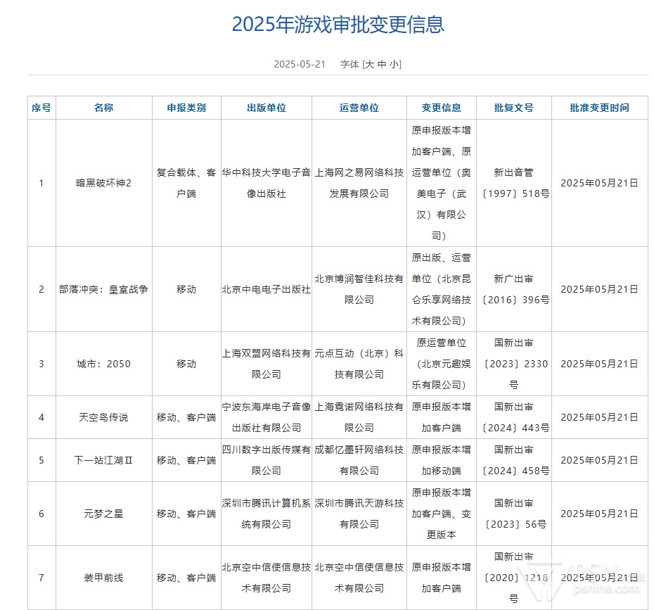 国家新闻出版署公开5月份网络游戏审批信息,《异环》(PS5、移动、客户端)等130款国产网络游戏过审,《彩虹岛:冒险》等14款进口网络游戏过审,7款游戏审批信息更改,其中《暗黑破坏神2》原申报版本增加客户端。