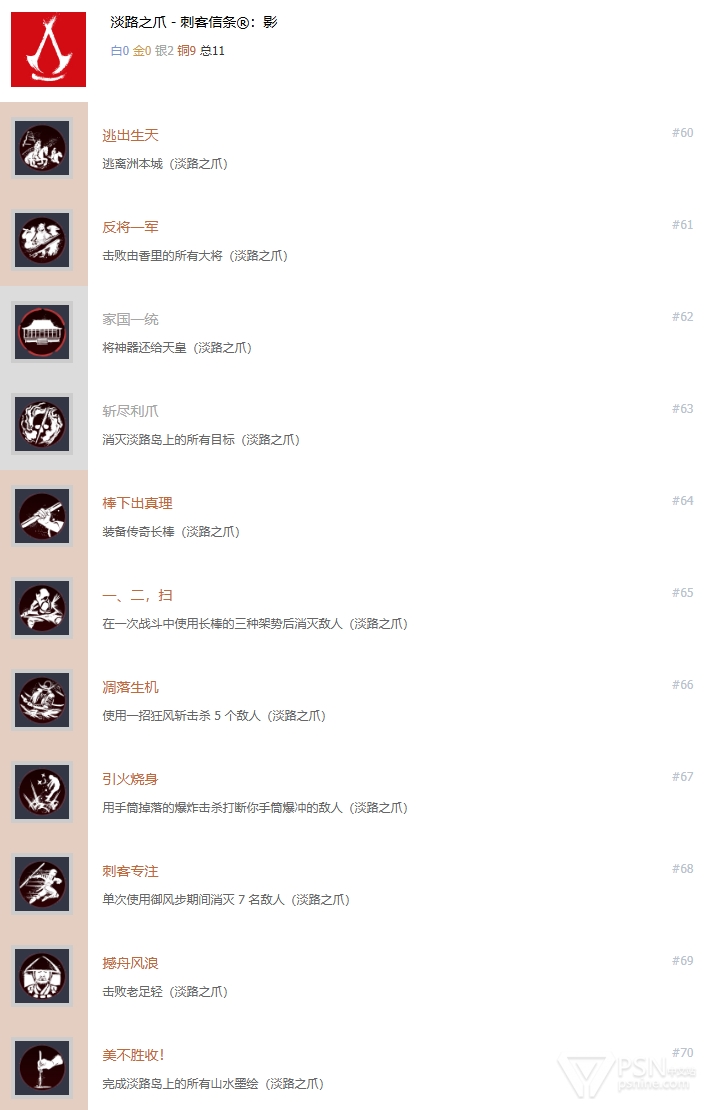 《刺客信条:影》DLC「淡路之爪」的推出为游戏加入了新奖杯,详情如图所示。