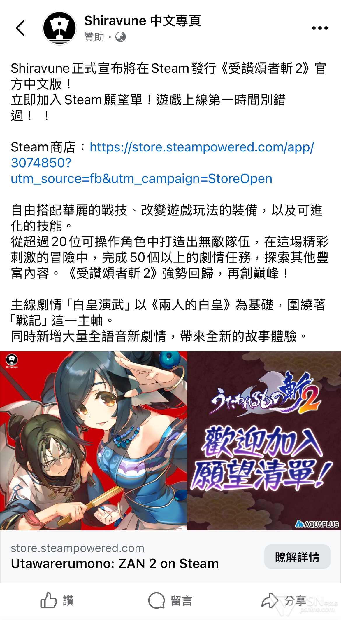 shiravune宣佈,將於steam發行「受讚頌者:斬2」(「傳頌之物:斬2」)中文版