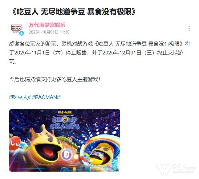 《吃豆人 无尽地道争豆 暴食没有极限》将于2025年11月1日下架停售,并于2025年12月31日终止运营。