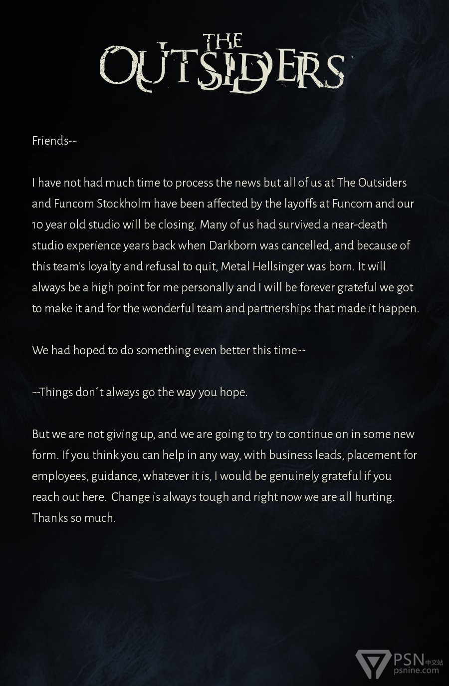 《重金属:地狱歌手》开发商The Outsiders创始人&创意总监David Goldfarb透露:The Outsiders和Funcom斯德哥尔摩受到了Funcom裁员的影响,即将关闭。