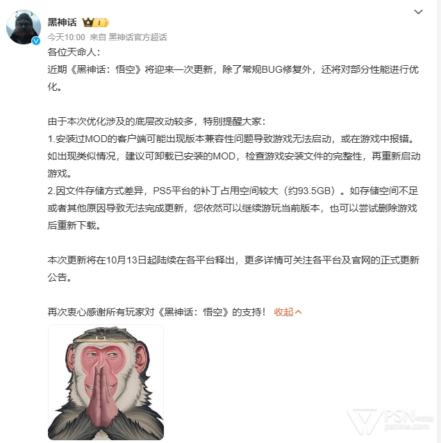 《黑神话悟空》将于10月13日起陆续在各平台推出更新,将修复一些BUG,并对部分性能进行优化,其中#PS5#平台的补丁大小约93.5GB。