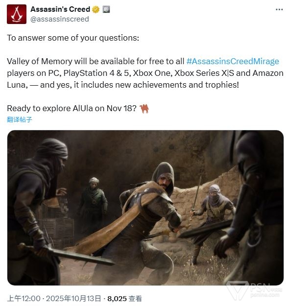 育碧透露:2025年11月18日推出的《刺客信条:幻景》免费DLC「回忆山谷」将会带来新奖杯