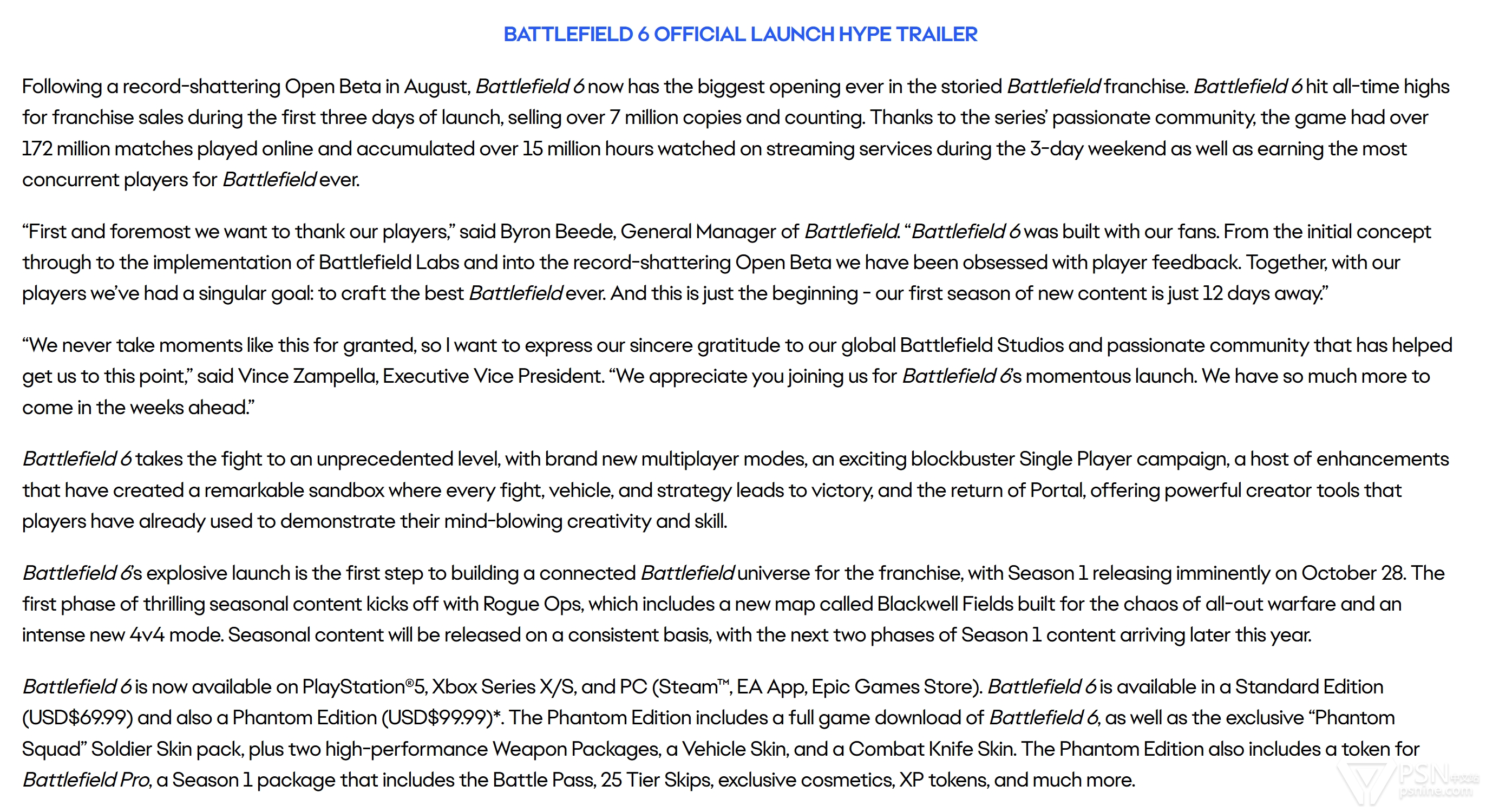 《战地6》发售三天,销量突破700万份——本作创下了《战地》系列同期的销售纪录。