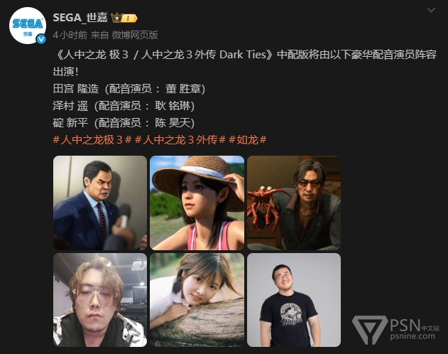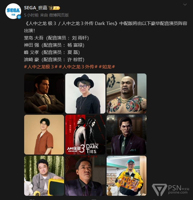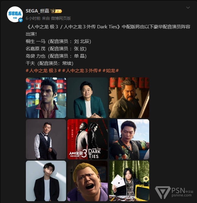 此外世嘉公布了《人中之龙 极3 / 人中之龙3外传 Dark Ties》中配配音演员阵容,具体见图