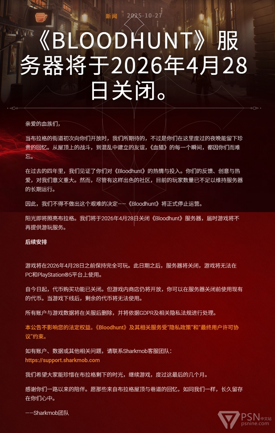 《吸血鬼:避世血族-血猎》将于2026年4月28日终止运营,公告发出的同时游戏的代币购买功能已关闭。
