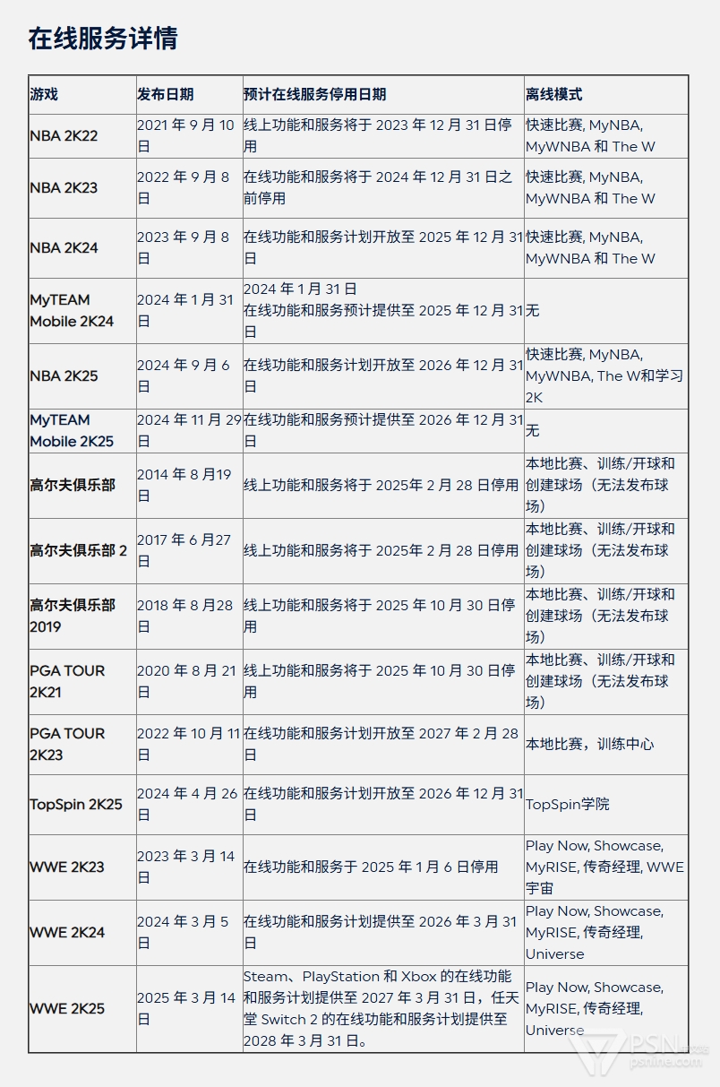 此外,曾在2025年2月-8月期间加入过PlayStation Plus升级/高级会员游戏阵容的《上旋高手2K25》将于2026年12月31日关闭在线服务。