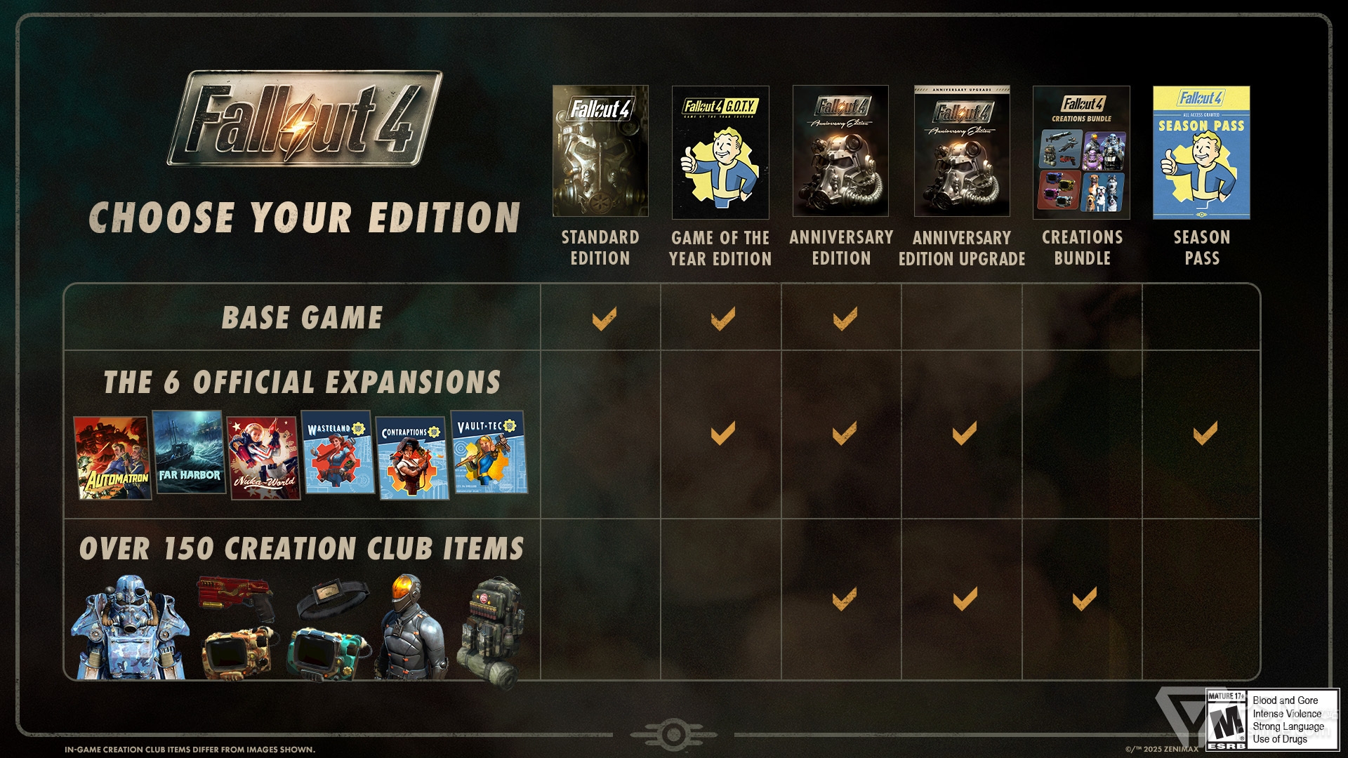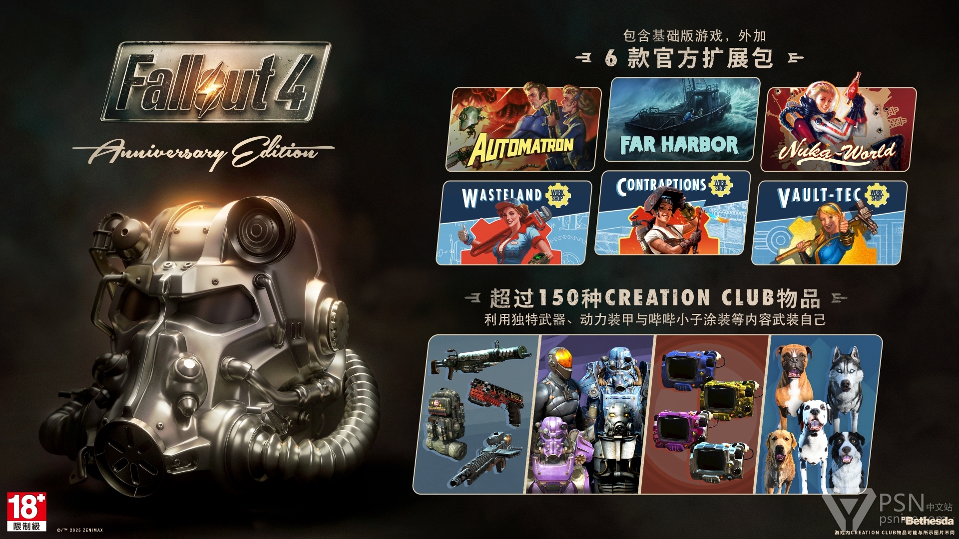 2025年10月23日,在2025年「辐射日」直播活动中贝塞斯达正式公布了《辐射4:周年版》(图1):其将于2025年11月10日发售,登陆PS4/PS5/Xbox Series/Xbox One/PC。周年版包含游戏本体、季票(6款扩展包)、Creations捆绑包(超过150项Creation Club内容)。