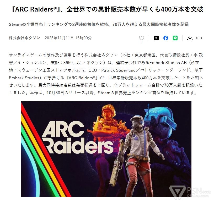 《ARC Raiders》销量突破400万份,全平台同时在线玩家数峰值突破70万。