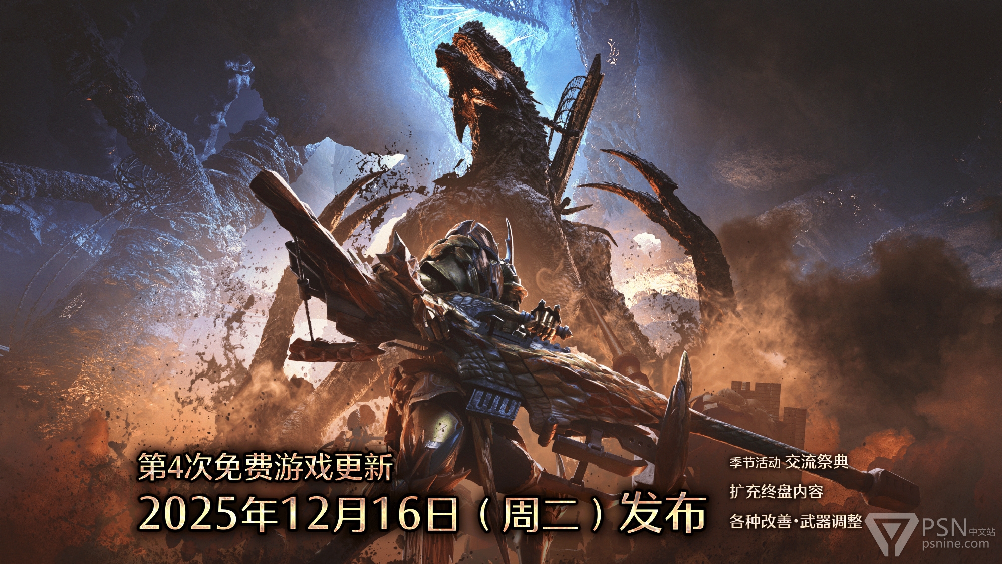 《怪物猎人 荒野》第四弹免费更新将于12月16日推出,主视图公布,此次更新将追加怪物“巨戟龙”、全新季节活动“交流祭典”,扩充终局内容以及针对武器的各项调整。