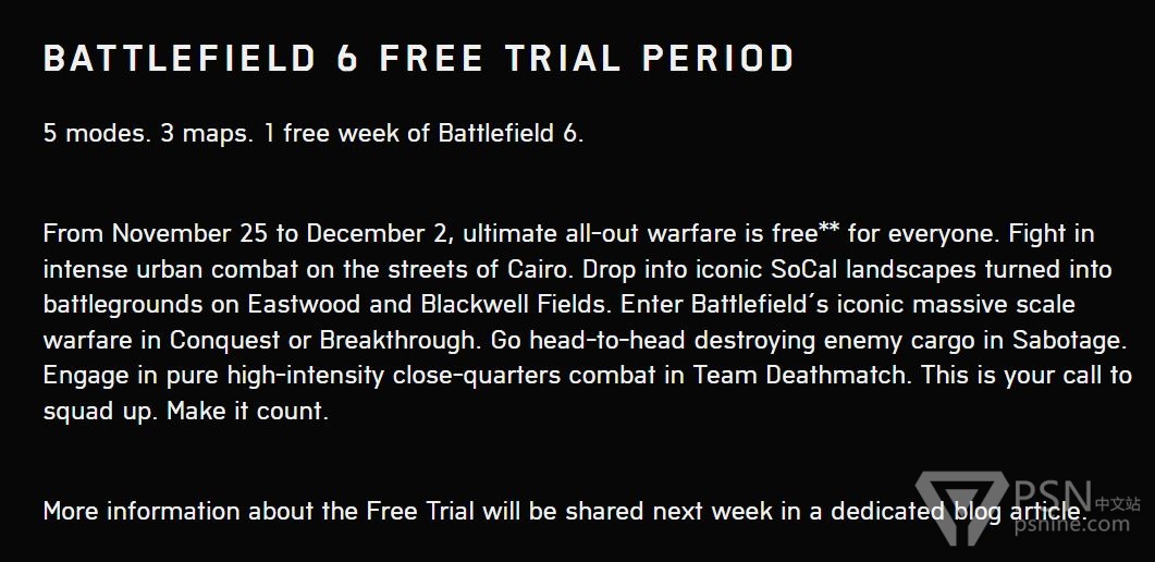《战地6》将在2025年11月25日-12月2日期间举行为期一周的免费游玩活动,这是本作发售后开展的首次免费游玩活动。