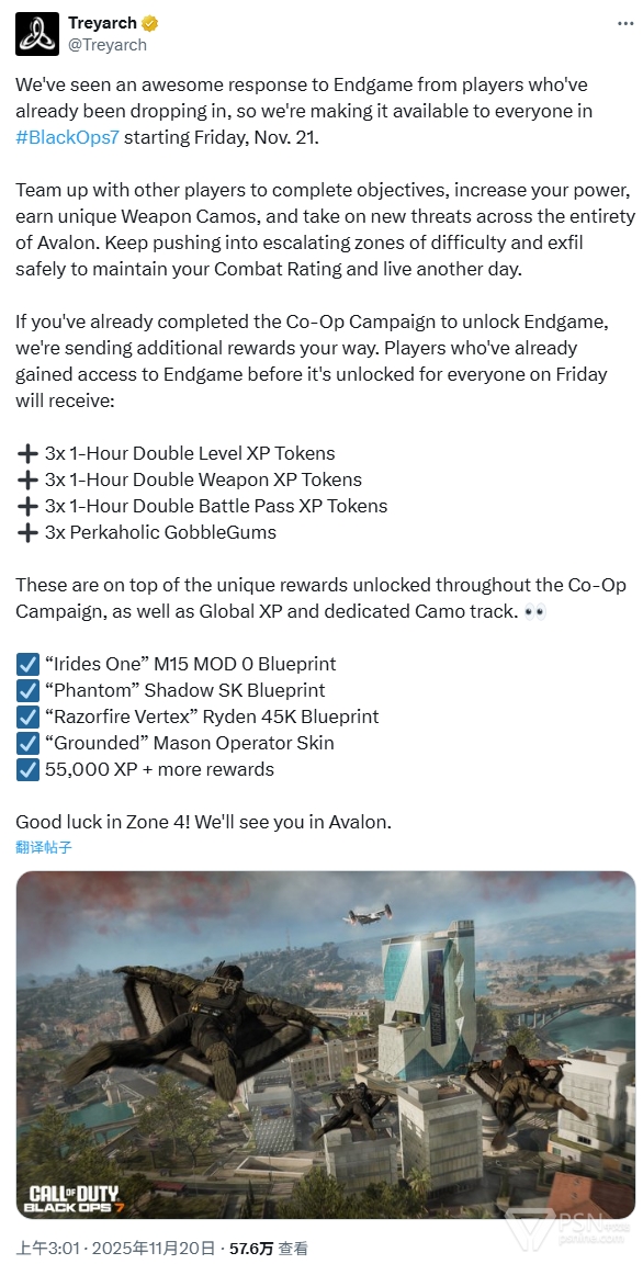 北京时间今天凌晨,开发商Treyarch宣布:此前在通关《使命召唤:黑色行动7》合作战役后方能解锁的终局模式「最终任务」,从2025年11月21日(北京时间可能是11月22日)起面向所有玩家开放、不再需要通关合作战役。