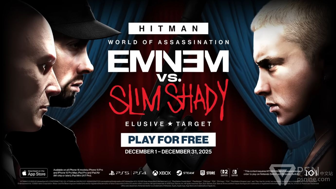《杀手:暗杀世界》新一期行踪不定的名人目标:「Eminem vs Slim Shady」,2025年12月1日-12月31日期间可免费游玩。