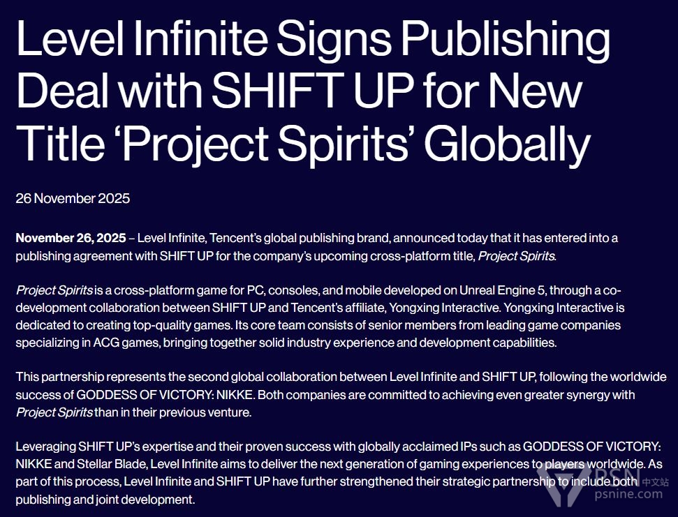 Level Infinite(隶属于腾讯互动娱乐,为其在海外的发行品牌)将负责发行Shift Up新作「Project Spirits」,Shift Up将与腾讯旗下的永星互动一起开发这款游戏。