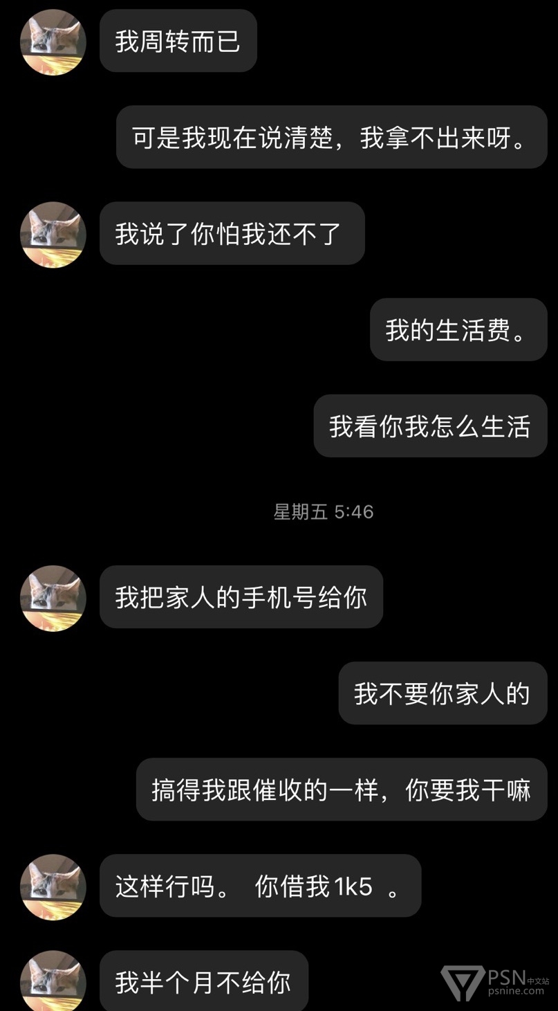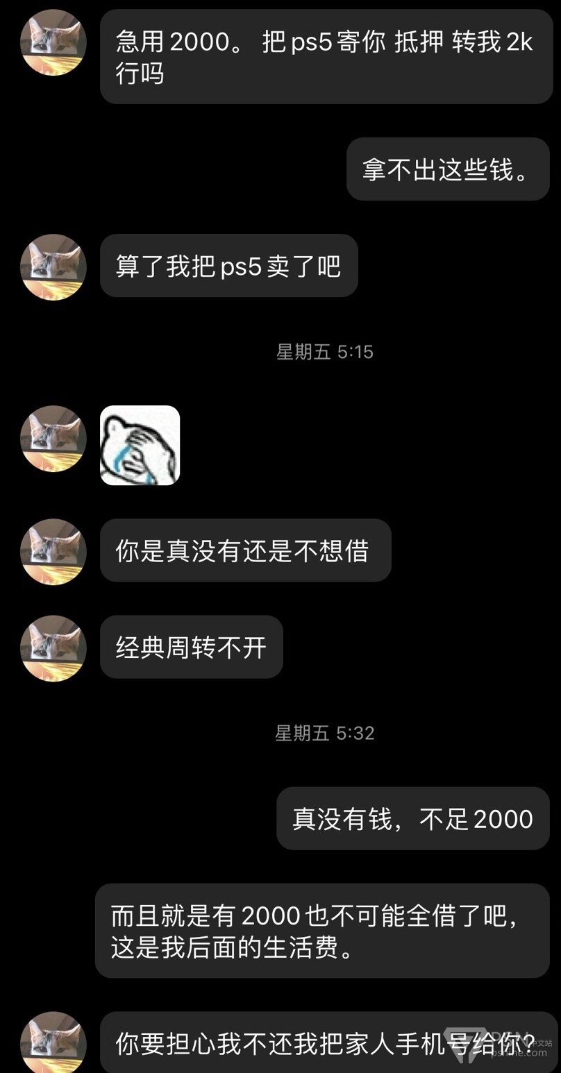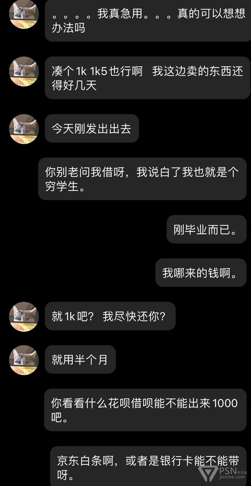 给各位朋友避坑一个天津人渣,此人经常活跃各个主机群,打着帮人解奖杯的幌子干着坑蒙拐骗勾当。经常问人借主机认证借ps5借账号借游戏盘借钱。一开口还大的吓人要借2000借不到就1000-500总归就是问到借不出为止,就连游戏机线坏了都想让人垫付一下。本人主要被他骗了一台ns,他还给我破解了。希望大家不要理会这个天津人渣,不要被骗。
