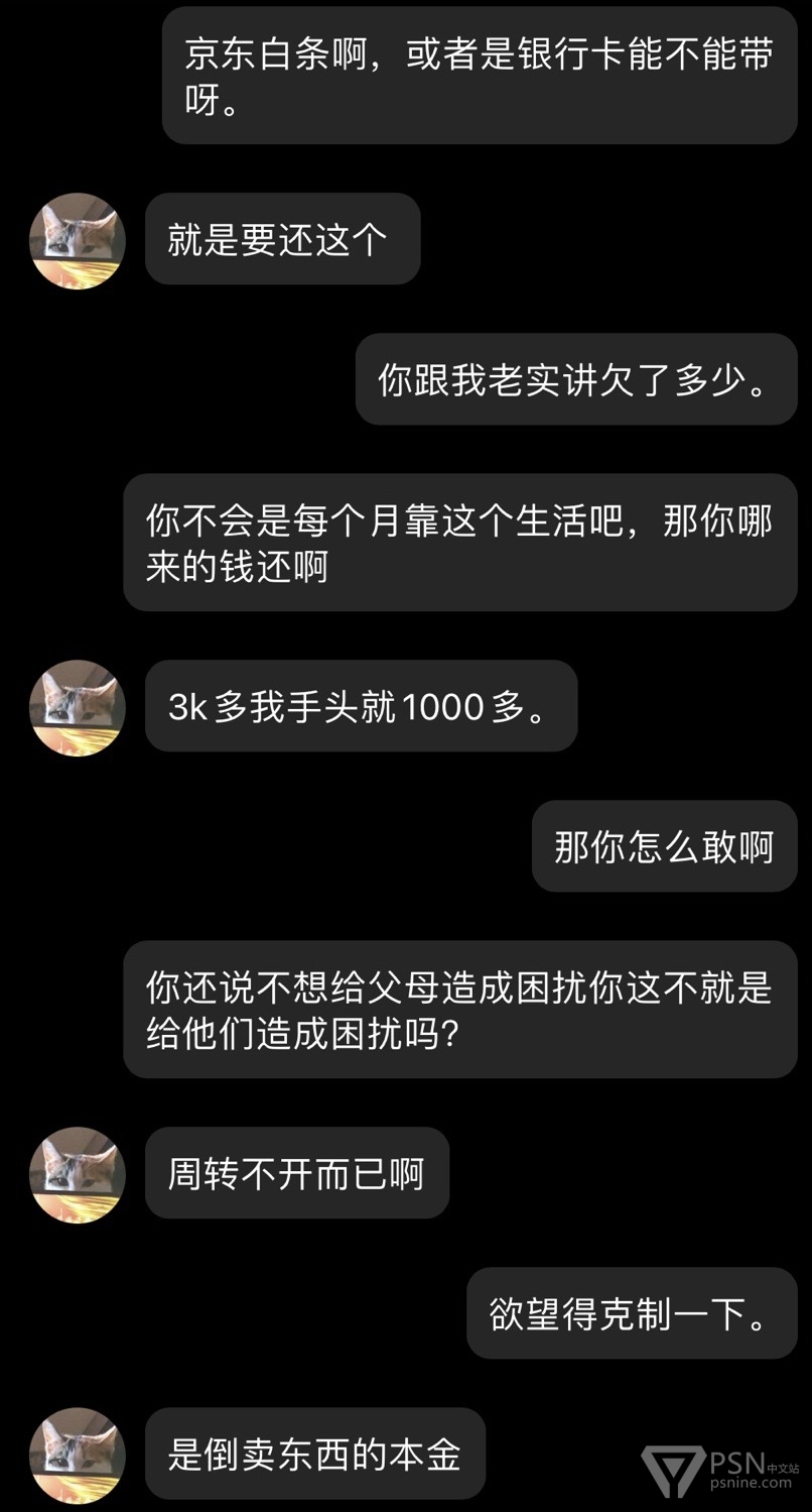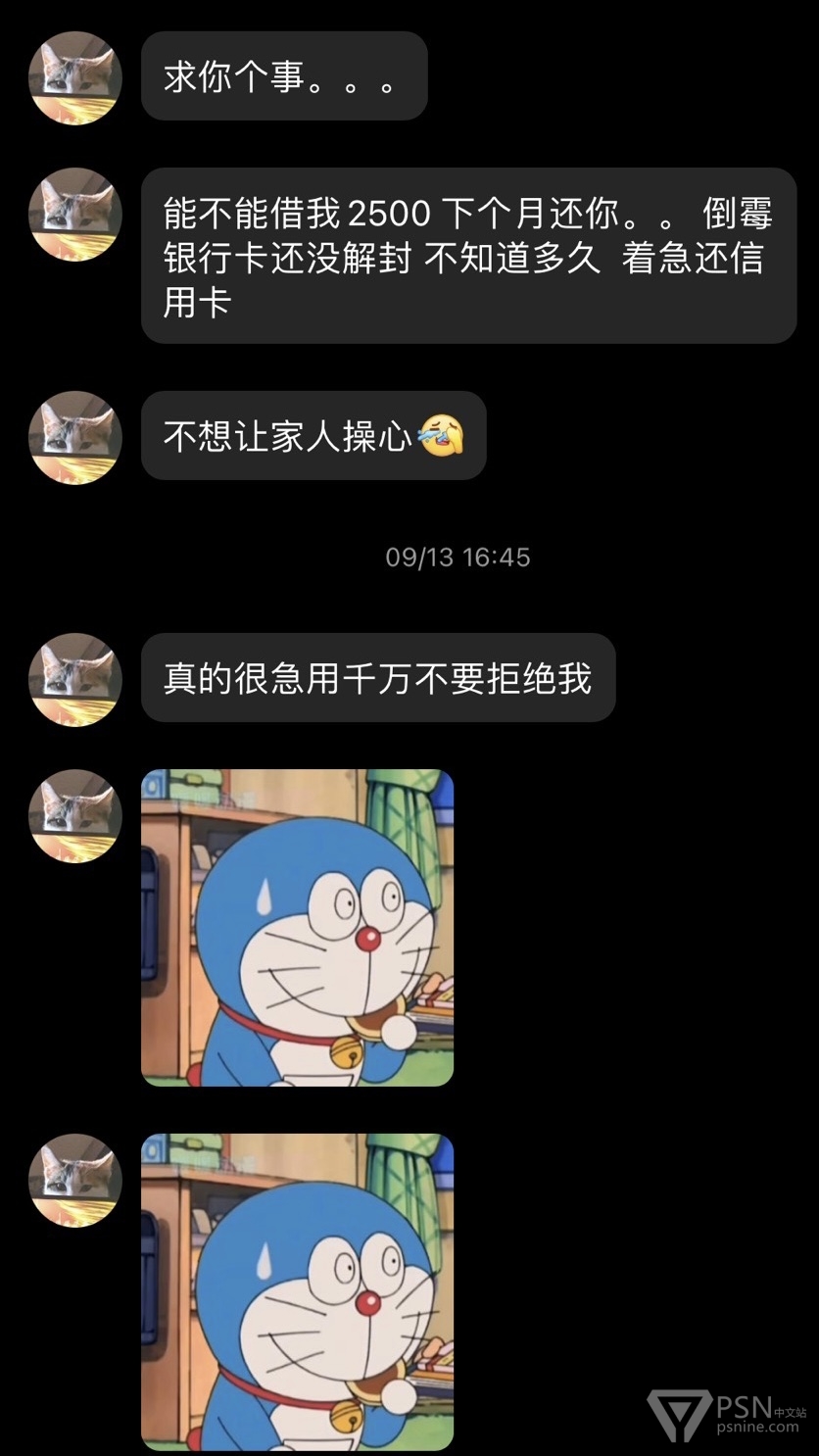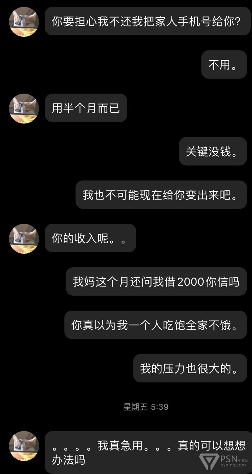 给各位朋友避坑一个天津人渣,此人经常活跃各个主机群,打着帮人解奖杯的幌子干着坑蒙拐骗勾当。经常问人借主机认证借ps5借账号借游戏盘借钱。一开口还大的吓人要借2000借不到就1000-500总归就是问到借不出为止,就连游戏机线坏了都想让人垫付一下。本人主要被他骗了一台ns,他还给我破解了。希望大家不要理会这个天津人渣,不要被骗。