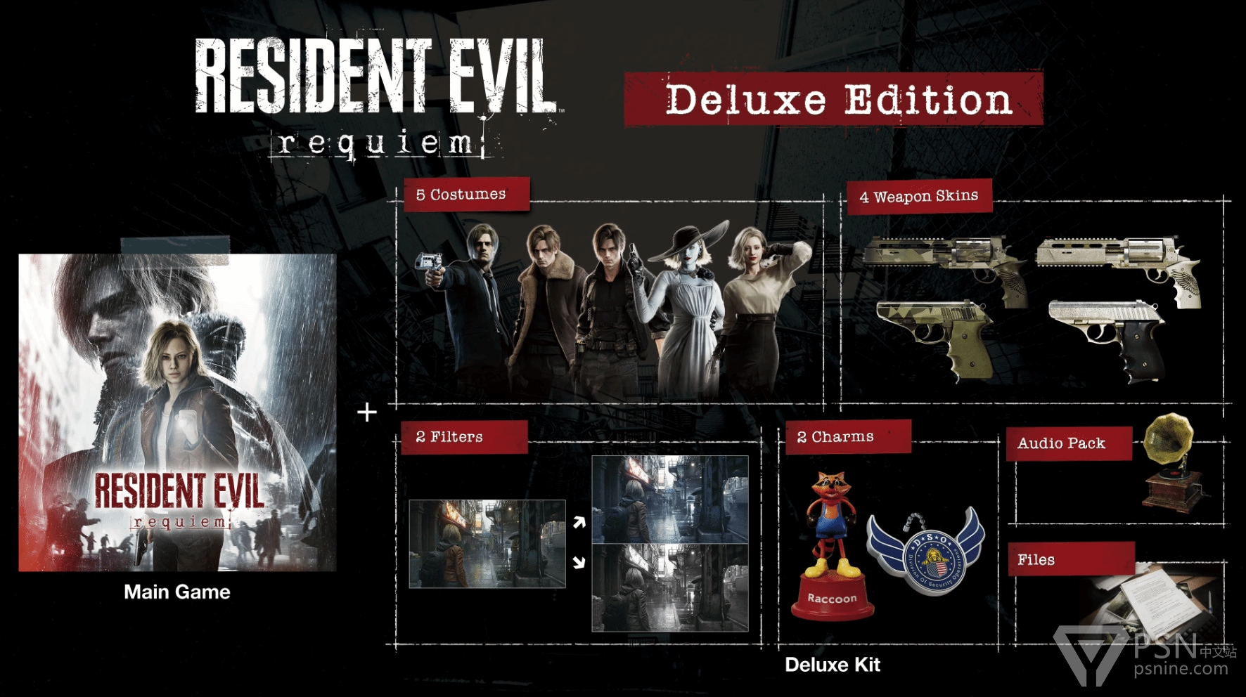 《生化危机9:安魂曲》豪华版奖励全部公开:格蕾丝&里昂共五套服装、武器外观等颁奖典礼结束后,卡普空也对《生化危机9》的官网进行了更新,其中豪华版奖励的情报现已全部解禁。除了此前公布的“八尺夫人”格蕾丝以外,还新增了性感包臀裙+眼神拉丝的“黑色电影”格蕾丝,以及里昂的三套服装“黑色电影”、“《生化危机4》”和“末日”。此外,豪华版奖励还包括了四种武器外观,两种滤镜,浣熊先生&DSO徽章两种挂件,“浣熊市经典”音乐及音效,以及文件:来自1998年的信。