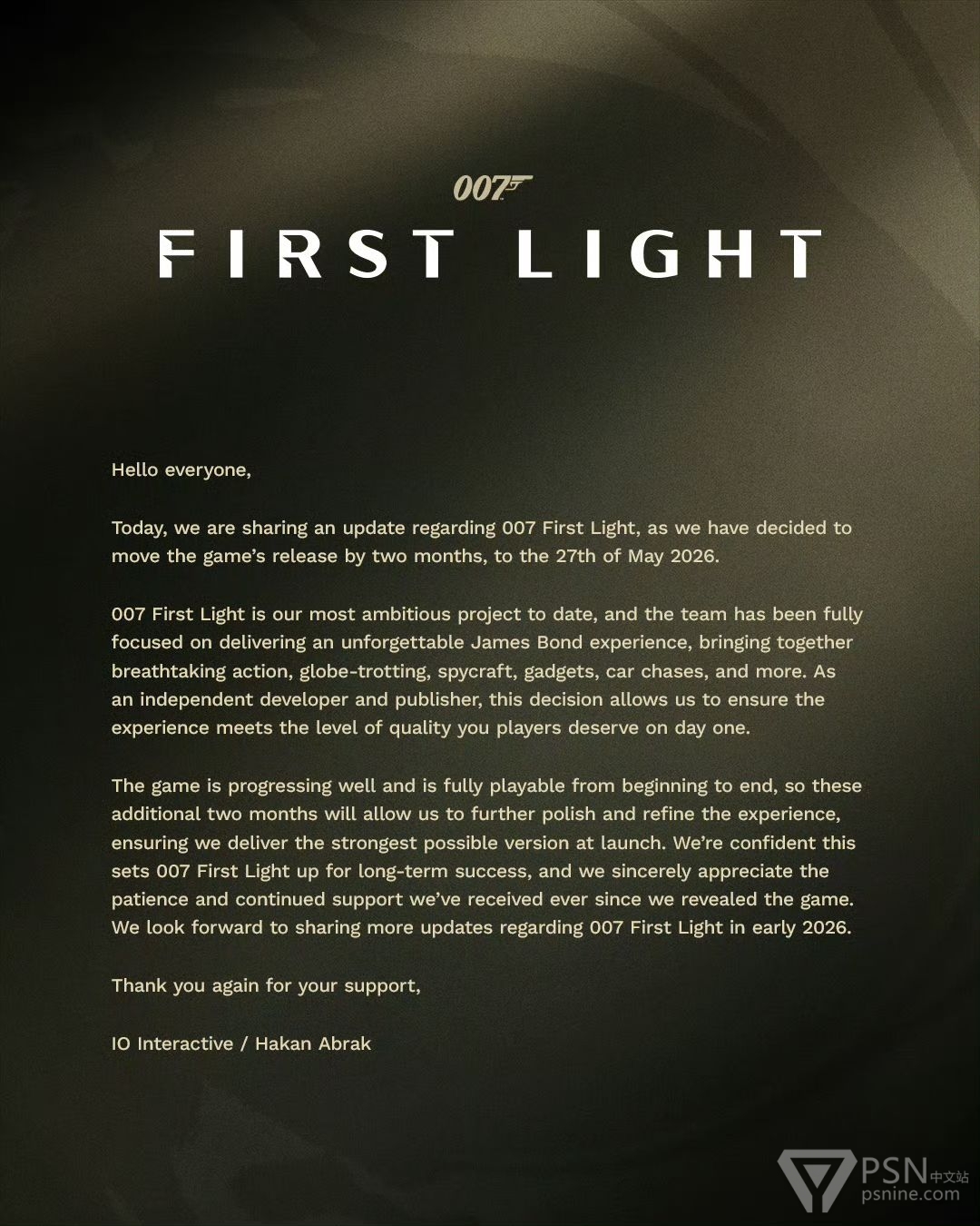原定于2026年3月27日发售的《007:初露锋芒》官宣延期,新的发售日期为2026年5月27日,登陆PS5、Xbox Series X|S、NS2和PC平台。