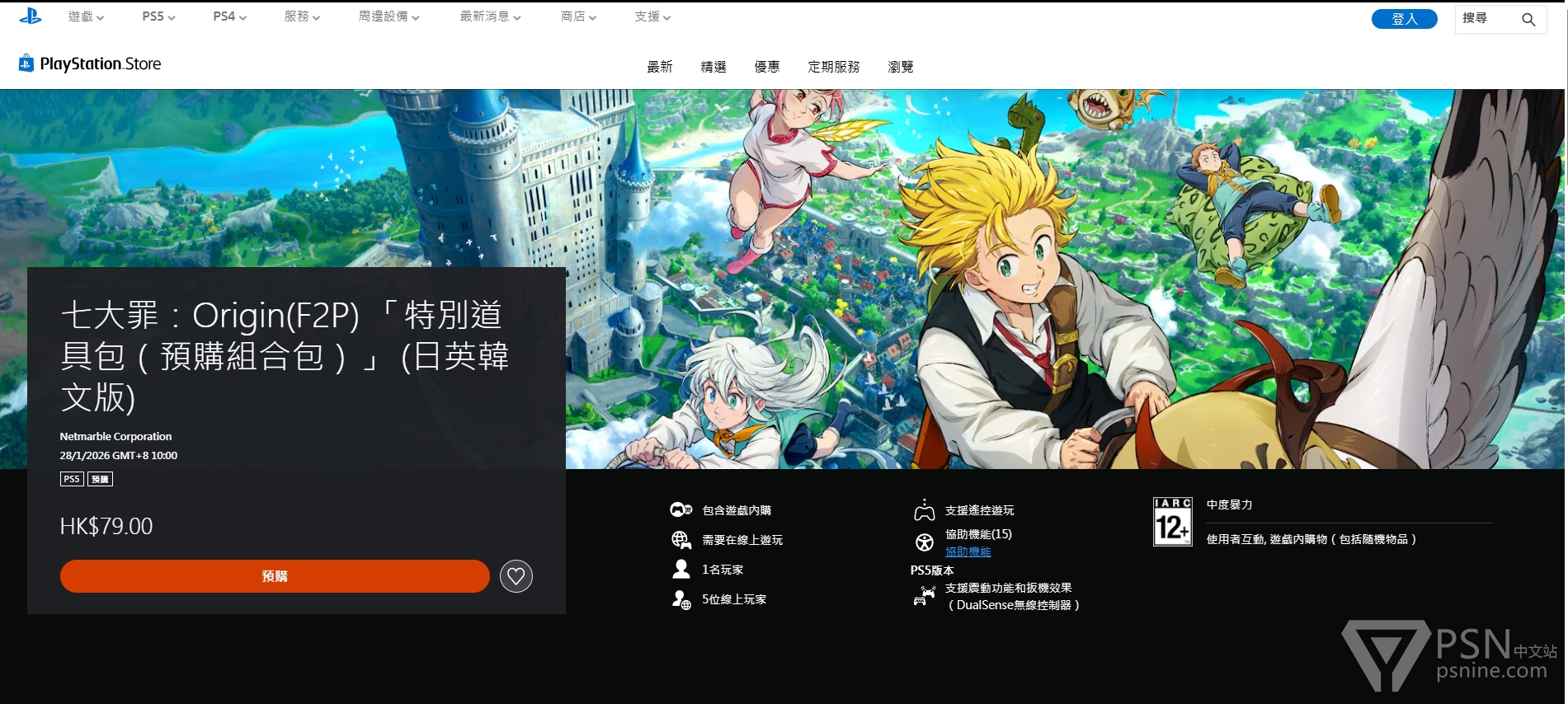 Netmarble开发的跨平台开放世界动作游戏《七大罪:起源》(七大罪:Origin(F2P) )开放了预购页面,还是免费游戏的老规矩,游戏免费游玩,目前付费能够解锁一堆道具,游戏预计2026-01-28上市,特别道具包售价79港币,出处是PSN商城游戏界面。