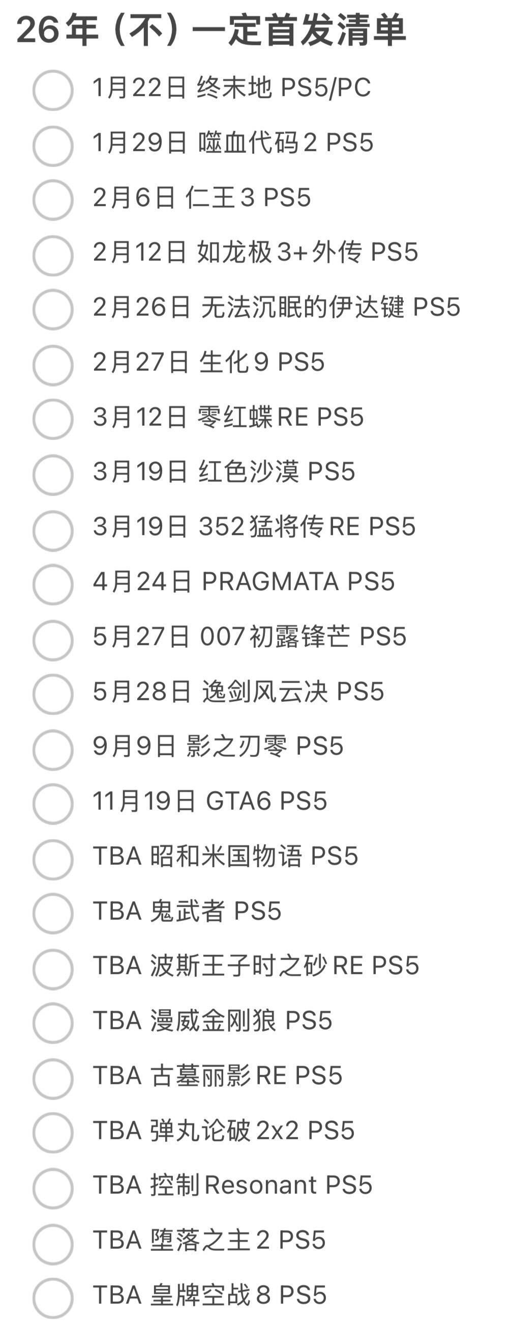 仁王3 如龙极3 生化9 红色沙漠 杀戮尖塔2 识质存在 SAROS 007 影之刃零 GTA6 地平线6 金刚狼 鬼武者:剑之道 古墓丽影:亚特兰蒂斯遗迹 控制2 战争机器E-Day 发条革命 漫威1943 光环:战役进化 堕落之主2——这一堆都是感兴趣的,要钱包危机了
