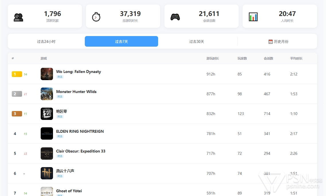 最近在做一个追踪ps用户精确时长的功能,类似于国外站点ps-timetracker.com。只要在我的小网站同步就能自动追踪大伙的游戏时长,如图2。基于此衍生出来几个功能,1是实时的游戏游玩人数,ps我感觉一直缺这个功能,隔壁steam都有,如图3。2是过去某段时间内的游戏游玩排行榜,如图4。但是苦于网站没啥关注,也没多少人,一天就新增一两个用户。基数太少就做不太起来。于是厚颜无耻的再来讲一下。网站:https://psnsgame.com/ 如果能人传人就好了,以上。