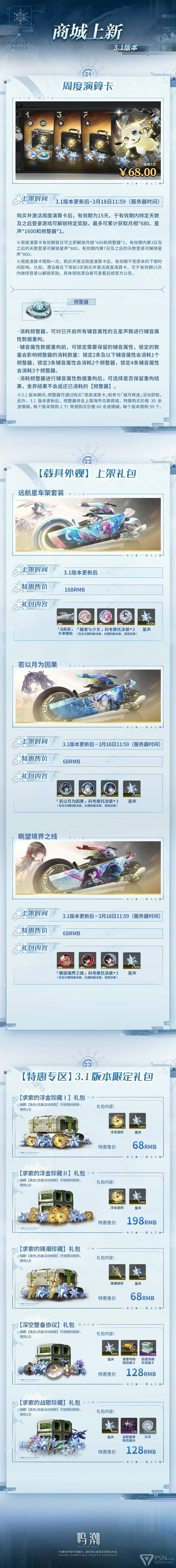 本期为漂泊者带来3.1版本中「长迹伴行」回馈系统、「凝月辉途」限时活动和「商城」内容的具体资讯。此外,活动期间漂泊者可免费领取1600星声、高级定制服饰「星火永明」等奖励,欢迎漂泊者查看!