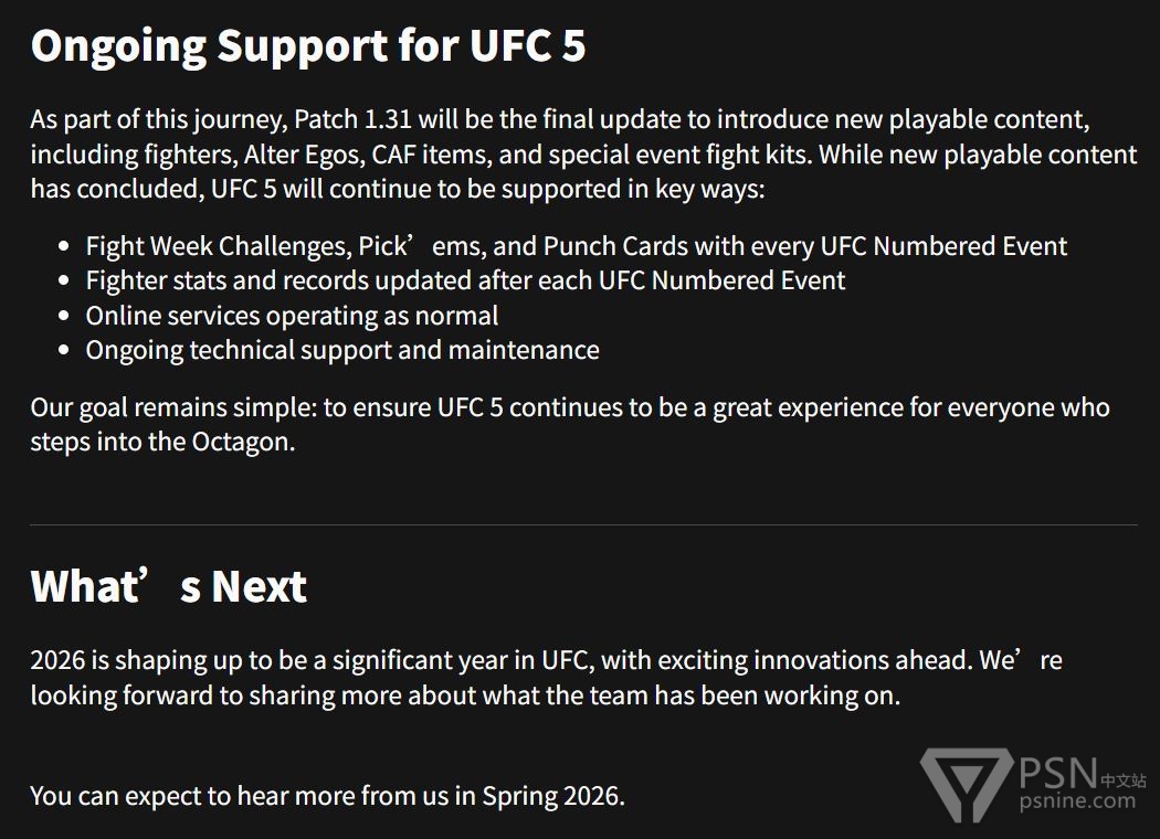 内容更新终止后,游戏的在线服务仍会继续开放、技术维护与支持将继续提供。游戏依然会推出现实中每场UFC数字赛的相关活动(挑战、竞猜、打卡),每场赛后也会更新选手的数据与战绩。
