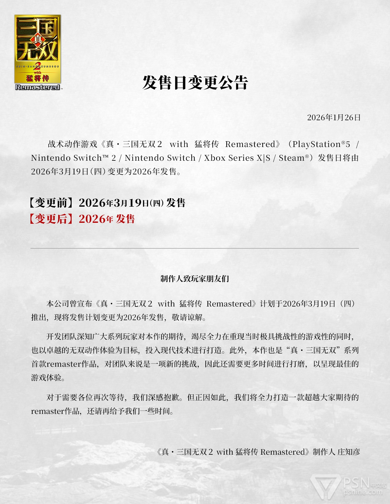 致所有期待《真·三国无双 2 with 猛将传 Remastered》的玩家们,战术动作游戏《真·三国无双 2 with 猛将传 Remastered》(PlayStation®5/Nintendo Switch™ 2/Nintendo Switch/Xbox Series X|S/Steam®)发售日将由2026年3月19日(四)变更为2026年发售。